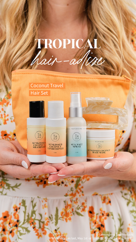 Sample nontoxic haircare – or get your favorites in vacation-ready sizes – plus an adorable hair clip and zip up travel bag. Everything in this set is TSA friendly. Available only in May and just $34.